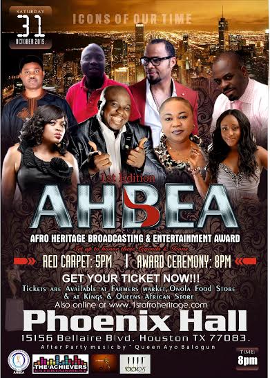 Mr Sola Olaniyan, the CEO and founder of Afro-Heritage Entertainment saw the importance of appreciating various professionals and artistes for a job well done, hence the reason why he would be hosting many Nigerian broadcasting and entertainment icons at the first edition of Afro-Heritage Broadcasting and Entertainment Award (AHBEA) which will hold at the Phoenix Hall, 15156 Bellaire Blvd, Houston, Texas. 77083. on Saturday October 31st 2015.