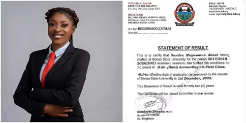 Sandra Mngusonun Abuul, a graduate of Benue State University (BSU) made her family proud by achieving a first-class honors in Accounting.