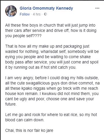 A Nigerian lady identified as Gloria Omommaty Kennedy just took to her Facebook account to rant after being ignored by the rich bachelors in her church again.
