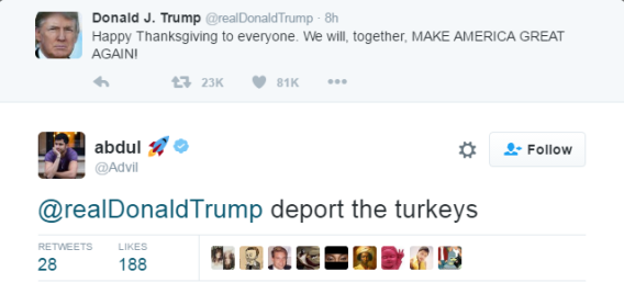 A Twitter user’s epic reply to Donald Trump’s Thanksgiving message