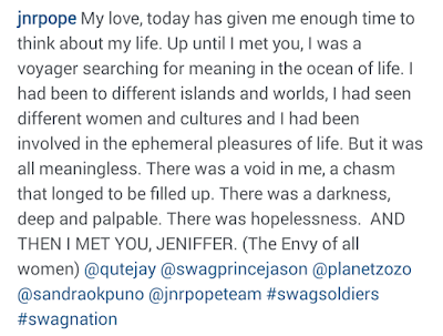 The two love birds got married on July 26th, 2014 in Asaba, Delta State and they are blessed with a baby boy. See what Jnr Pope wrote on his page to celebrate their anniversary and see another photo after the caption…