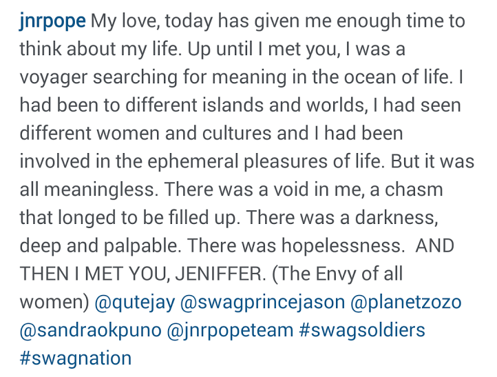 The two love birds got married on July 26th, 2014 in Asaba, Delta State and they are blessed with a baby boy. See what Jnr Pope wrote on his page to celebrate their anniversary and see another photo after the caption…