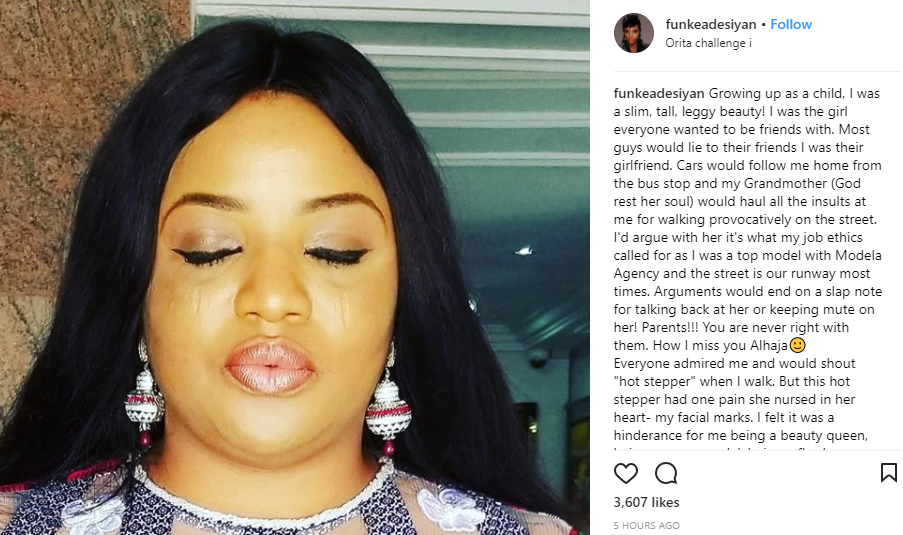 Nollywood actress, Funke Adesiyan has revealed how her tribal marks affected her self-esteem to the point that she failed several times in achieving her goals in life.