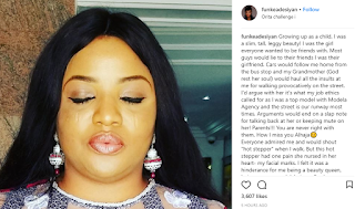 ”Growing up as a child, I was a slim, tall, leggy beauty! I was the girl everyone wanted to be friends with. Most guys would lie to their friends I was their girlfriend. Cars would follow me home from the bus stop and my Grandmother (God rest her soul) would haul all the insults at me for walking provocatively on the street. I’d argue with her it’s what my job ethics called for as I was a top model with Modela Agency and the street is our runway most times. Arguments would end on a slap note for talking back at her or keeping mute on her! Parents!!! You are never right with them. How I miss you Alhaja