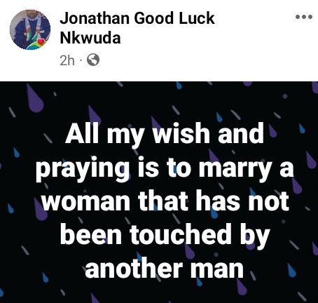 A Nigerian man identified as Jonathan Goodluck Nkwuda has taken to Facebook to state that he desires to marry a virgin.