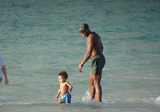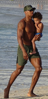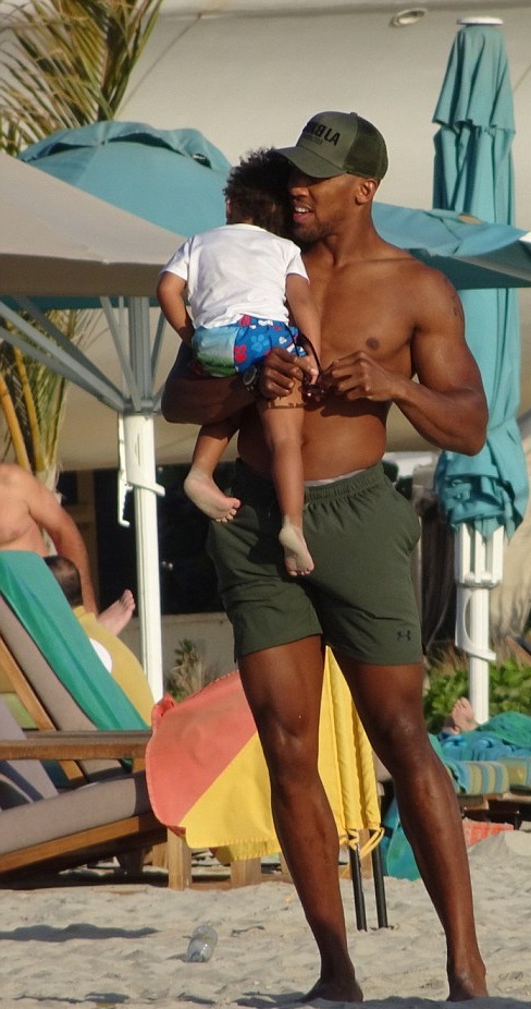 Showing off his musclebound physique, Anthony donned a pair of khaki swimming trunks whilst he accessorised with a baseball cap and shades. Beaming broadly, the world heavyweight champion seemed in great spirits as he ran across the shore line with his son in tow.
