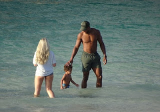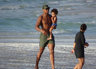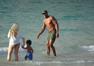 Cuddling up to his little one, the 28-year-old boxer waded into the sea with Joseph on his hip, before the group frolicked in the waters together.