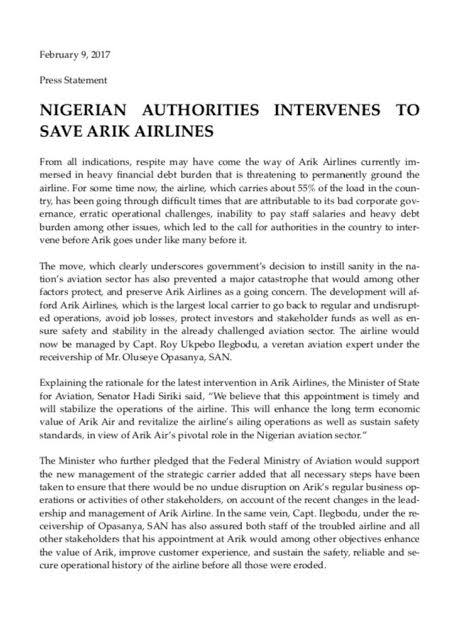 The Federal Government has announced a take over of Arik Airline, which has recently been experiencing difficulties. According to the Minister of State for Aviation, Hadi Sirika, the government’s decision to take over the management of Arik Airlines would stabilise its operations, enhance its long term economic value, revitalise its ailing operations, and sustain safety standards, in view of its pivotal role in the Nigerian aviation sector.
