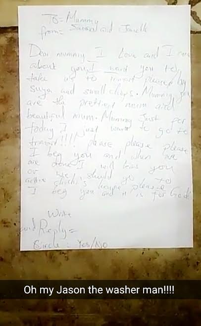 Basketmouth’s wife Elsie shared this cute request note their son Jason directed her to read. The young man showered his mum with so much love and stylishly made requests in between.