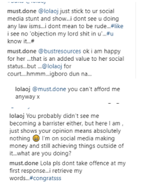Temitope added that Lola should stick to her social media business.