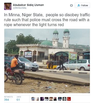 According to twitter user @MrAbuSidiq, in Minna, Niger State, people disobey traffic rules so much that the police officers have no choice but to cross the road with a rope whenever the light turns red.