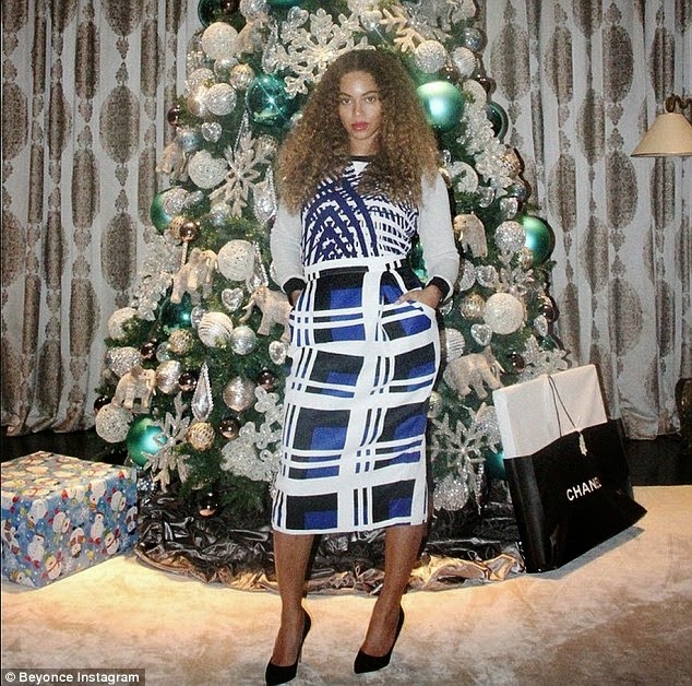 Mrs Carter recently shows off her beautiful Christmas tree adorned with shiny silver and green decor, crystal balls, toy elephants and snow flakes.