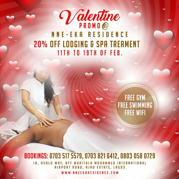 To celebrate this year’s Valentine, Nne-eka Residence is giving 20% off lodging and 20% off Spa treatments. That’s right! Let’s help make your Valentine memorable.