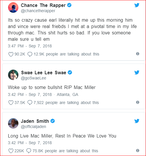 The music industry and the world at large was surprised to hear about the news of American rapper, Mac Miller‘s death on Friday September 7th, 2018 . The 26-year-old was said to have died due to suspected drug overdose. His friends and celebrities reacted to the the news of his shocking death on social media.