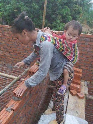 The photos posted on Facebook shows a young mother laying bricks while carrying her child on her back. Another photo after the cut…