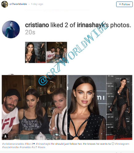 Eagle-eyed Ronaldo fans noticed the footballer liked some pictures on Irina’s Instagram account on Wednesday. Is Ronaldo trying to recapture his old flame? Who knows.. See the photos after the cut.