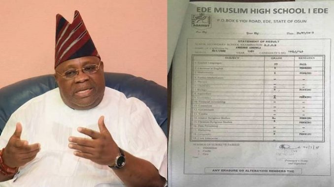 His academic claims have, however, been brutally challenged. According to recently circulated claims, Adeleke registered for GCE O’ Level in 1981 but had F9 in English Language and was recorded absent for other subjects. It also said he has no degree from JSU where he registered as Jackson Ademola Adeleke, while providing what it titled as official records of his enrollment.