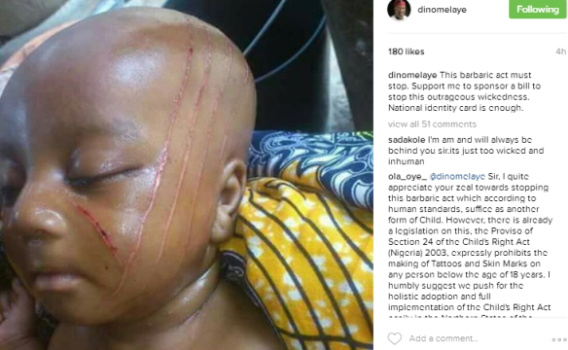 Senator Dino Melaye says this barbaric act of applying tribal marks on children must stop. According to him, the National identity card is enough form of identification. He plans to sponsor a bill that will prohibit this outrageous practice.