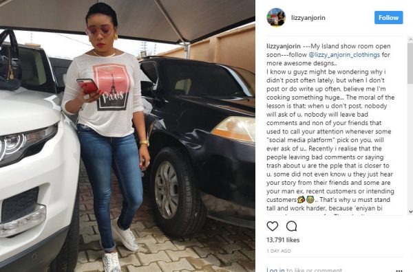 “I know you guyz might be wondering why I didn’t post often lately, but when I don’t post or do write up often, believe me I’m cooking something huge. The moral of the lesson is that; when u don’t post, nobody will ask of u, nobody will leave bad comments and none of your friends that used to call your attention whenever some “social media platform” pick on you, will ever ask of u.. Recently i realise that the people leaving bad comments or saying trash about u are the people that is closer to u, some did not even know u they just hear your story from their friends and some are your man ex, recent customers or intending customers.