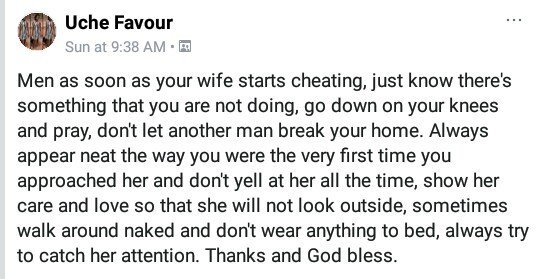 “Men as soon as your wife starts cheating, just know there’s something that you are not doing, go down on your knees and pray, don’t let another man break your home. Always appear neat the way you were the very first time you approached her and don’t yell at her all the time, show her care and love so that she will not look outside, sometimes walk around Unclad and don’t wear anything to bed, always try to catch her attention. Thanks and God bless.”