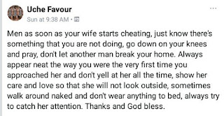 A Nigerian lady identified as Uche Favour on Facebook has used the platform to advice married men on what to do when they find out that their wife is cheating.