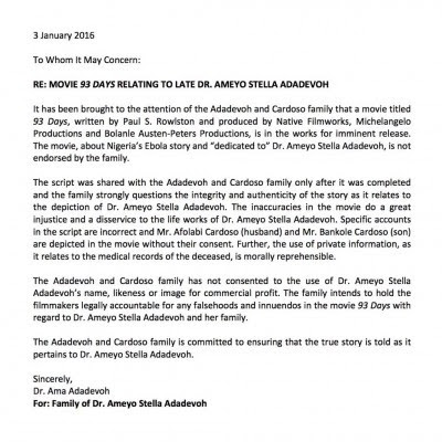 When Steve Gukas decided to use Dr Adadevoh’s story to produce an Ebola movie, ’93 Days’, everybody saw it as a way of immortalizing the brave Doctor, who died in the line of duty. That, may not be the case, as the Adadevoh’s family are currently taking legal actions against the unsuspecting movie producer for not asking for permission before immortalizing the Doctor who died in the line of duty to allow others to live.