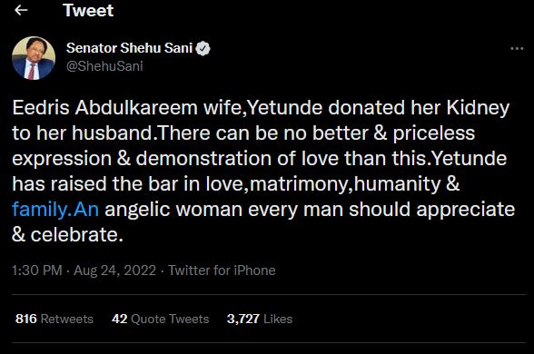 Reacting to this, Sani in a tweet stated that Yetunde’s gesture is the highest demonstration of love, adding that she has raised the bar in matrimony.