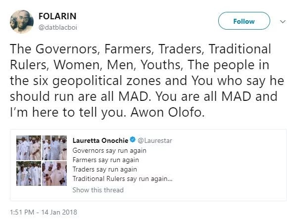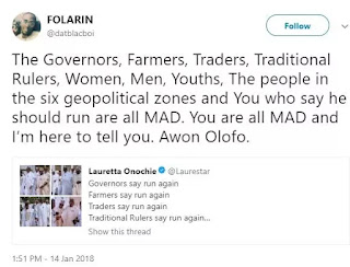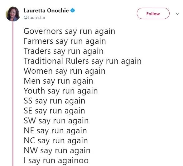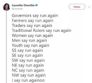 Today, President Buhari’s media aide Lauretta Onochie shared a tweet that says Governors, farmers, traders, traditional rulers and practically everyone is telling her boss to run again.