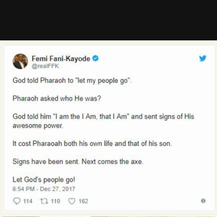 Despite well wishes greetings across board, Mr. Fani-Kayode in a tweet that relates to the Mr. Buhari’s situation wrote: “ God told Pharaoh to “let my people go”.