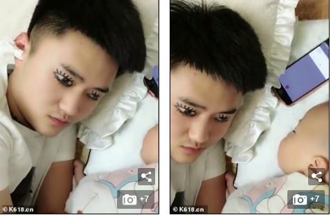 The exhausted man, filmed lying on a bed with his infant son, drew a pair of fake eyes on his eyelids to make the child believe he was still awake.