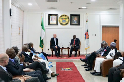 The new FIFA President, Gianni Infantino has paid the Governor of Lagos State, Akinwumi Ambode a visit at the Lagos House, Alausa, Ikeja, on Monday, February 19, 2018. The FIFA president was accompanied by the President of Nigeria Football Federation, Amaju Pinnick and a host of others.