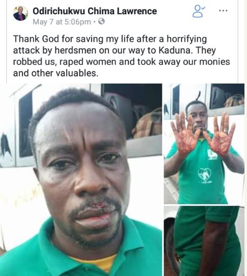 Some armed bandits reportedly r*ped some female occupants of a vehicle while others were viciously beaten with injuries inflicted on them. A Nigerian Pastor Chima Lawrence has taken to Facebook to share the story of how herdsmen attacked and robbed them on their way way to Kaduna last week.
