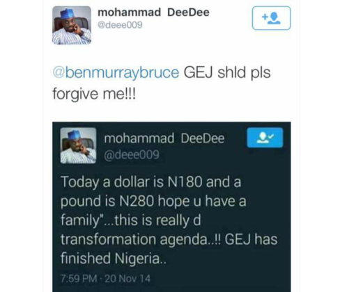 The former President today replied a twitter user who apologized for calling him out on social media back in 2014, saying he’d finished Nigeria following an increase in foreign exchange rate. ‎Not knowing it will get far worse in 2017. See GEJ’s reply after the cut…