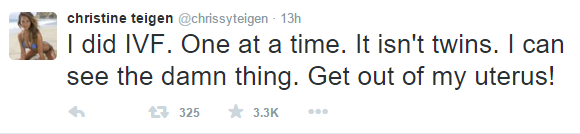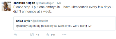 Some fan whose eyes is as sharp as the eagle’s recently told the expectant mother that she might be having twins because she got pregnant through IVF. See Chrissy’s response below…