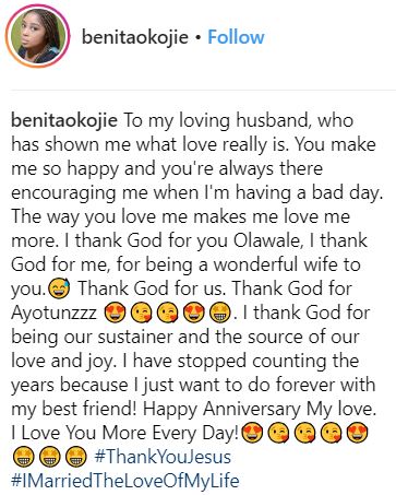 “To my loving husband, who has shown me what love really is. You make me so happy and you’re always there encouraging me when I’m having a bad day. The way you love me makes me love me more. I thank God for you Olawale, I thank God for me, for being a wonderful wife to you.