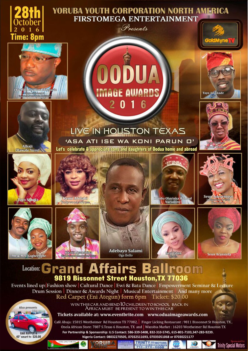 This year’s edition of Oodua Image Awards will hold in the city of Houston, Texas, United States of America on Friday, October 28, 2016 at Grand Affair Ballroom, 9819 Bissonnet Street, Houston. TX.77036