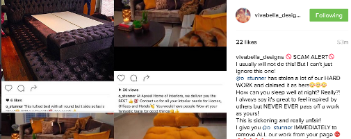 How can you sleep well at night? Really?! I always say it’s great to feel inspired by others but NEVER EVER pass off a work as yours. This is sickening and really unfair! I give you @o stunner IMMEDIATELY to remove ALL our work from your page” Sandra wrote in a post on IG