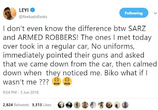 According to him, ‘I don’t even know the difference btw SARZ and ARMED ROBBERS! The ones I met today over took in a regular car, No uniforms, immediately pointed their guns and asked that we came down from the car, then calmed down when they noticed me. Biko what if I wasn’t me ?’.