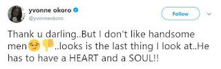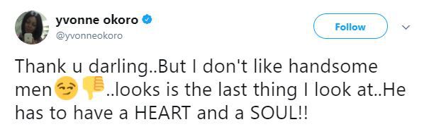Ghanaian actress Yvonne Okoro has taken to her Twitter page to reveal that she doesn’t like handsome men.
