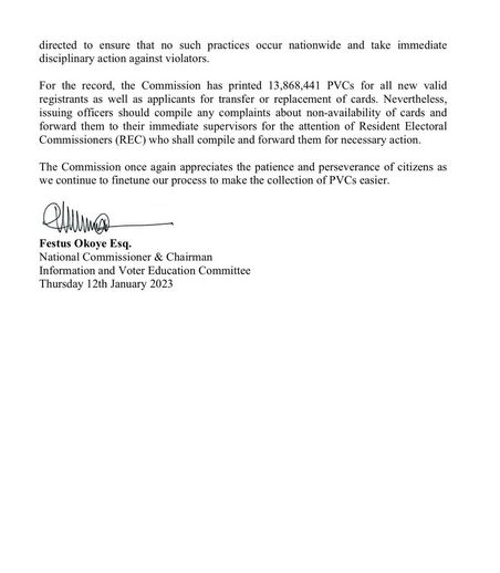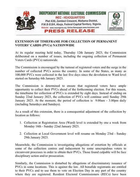 According to a statement released by the electoral body, collection of PVCs at the registration Area (Ward) level is extended from January 16 to 22 while collection at Local Government level will resume from January 23 to 29.