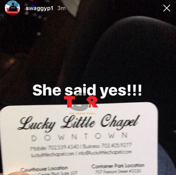 Paloma shared a video on her IG page with Nick Young driving to Vegas Friday. Then Nick shared a photo of both of them in Vegas and another one at a Chapel in Vegas where he wrote “She said YES! However, he deleted that post immediately but not before TSR got a screenshot of it.