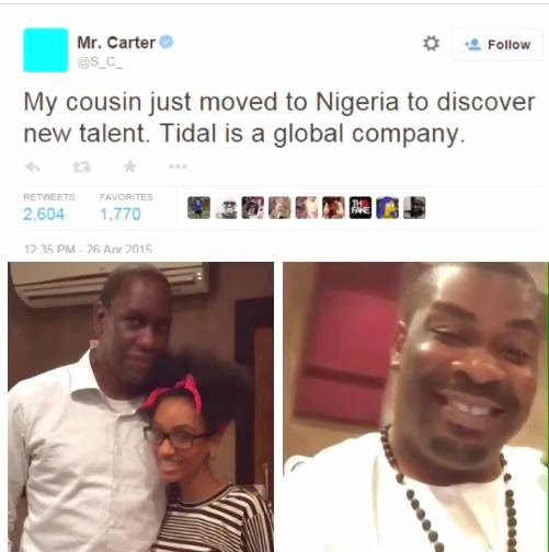 Mr Carter announced that his cousin, Briant Biggs has moved to Nigeria to discover new talent for their Tidal company.