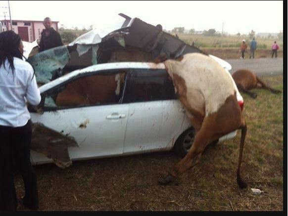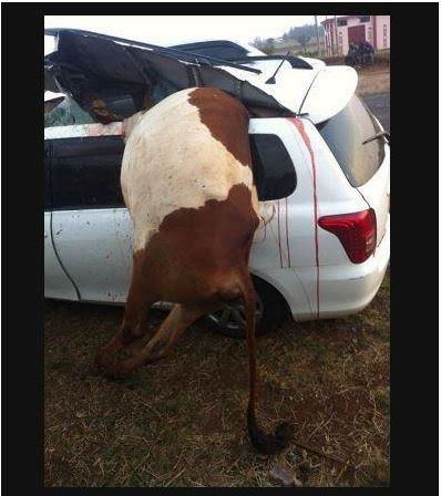 A bizarre accident was witnessed Thursday morning on the Ruiru-Kiambu road after an unidentified driver knocked down and killed nine cows. According to Kenyans.co.ke, the motorist, who sustained minor injuries is at large and police officers are presently hunting for him. More photos after the cut…