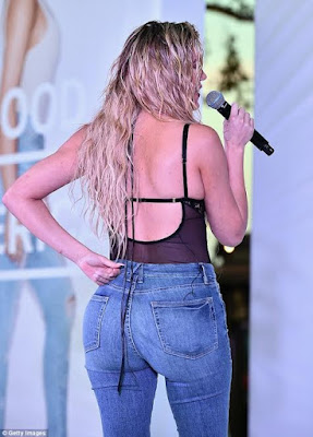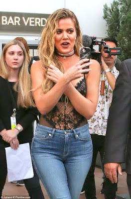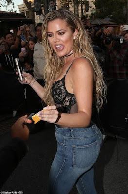 Khloe Kardashian left little to the imagination in a sheer lacy black top and her own branded ‘Good American’ jeans designed to make women feel “positive in their skin” as she launched her new denim brand on Tuesday night. Her mum, Kris and her sister Kourtney were also at the event to support her. More photos after the cut.