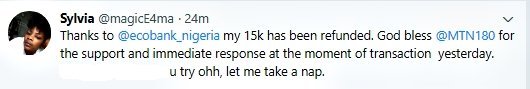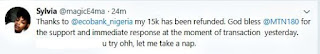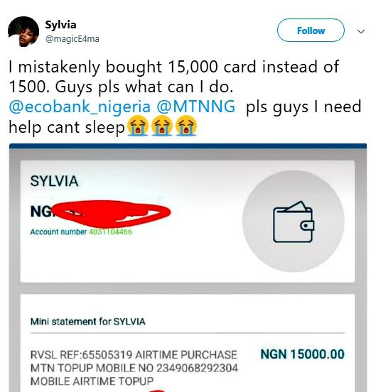 A Twitter user identified as Sylvia (@magicE4ma) has expressed appreciation to EcoBank and MTN Nigeria for coming to her aid after she mistakenly bought N15,000 instead of N1,500 airtime through MTN Virtual Top-Up (VTU) from her bank account.