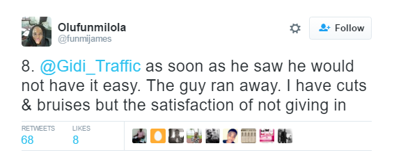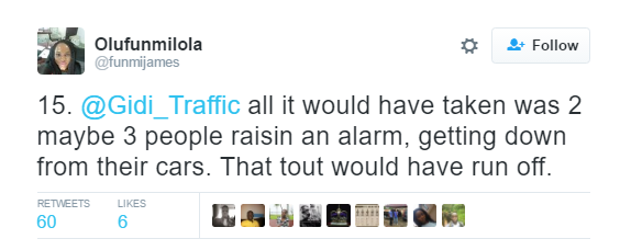 While she put up a fight after the glass of her car was smashed by the thief in broad daylight, she was more disappointed that everyone around her just continued looking and refused to help. It took the intervention of her husband, who was some cars behind her, before the thief scampered away. Read more of her tweets as you continue and tell us what you think…