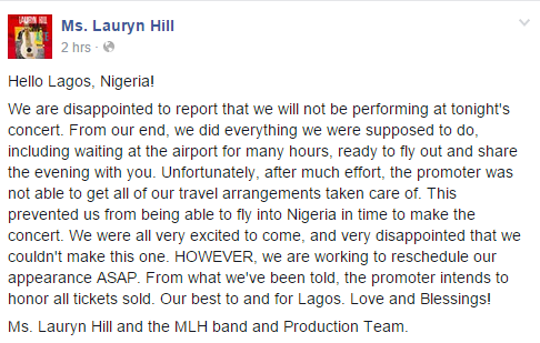 American music artiste, Lauryn Hill was supposed to be at the sold out May Day concert in Lagos, Nigeria on Friday May 1, 2015 but couldn’t make it.