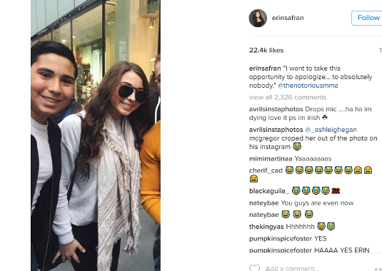 The fighter posted the picture he took with them but not before he cropped them out. When Erin noticed it, she went on twitter to share a photo collage of the original picture and the one Conor McGregor shared.