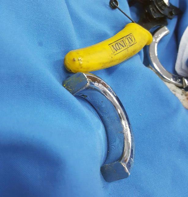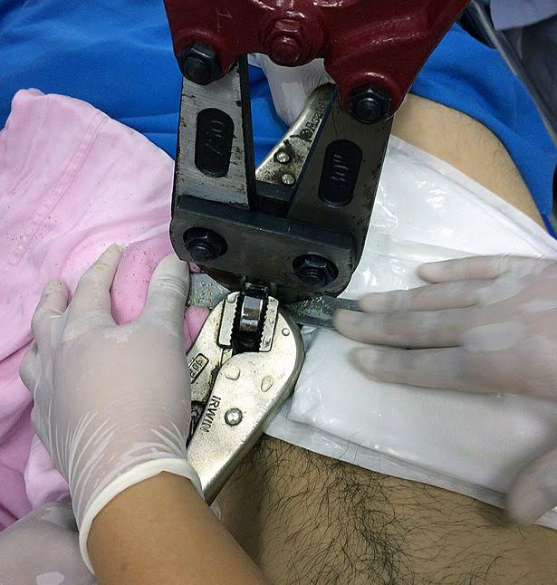 The incident took the doctors three hours using a bolt cutter and a saw to set him free.