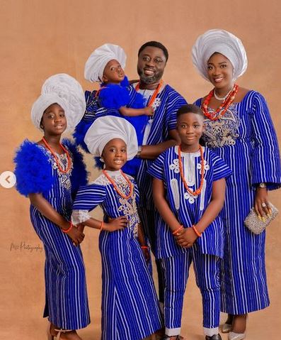 The couple and their kids wore a blue and white striped aso oke with beads to match.